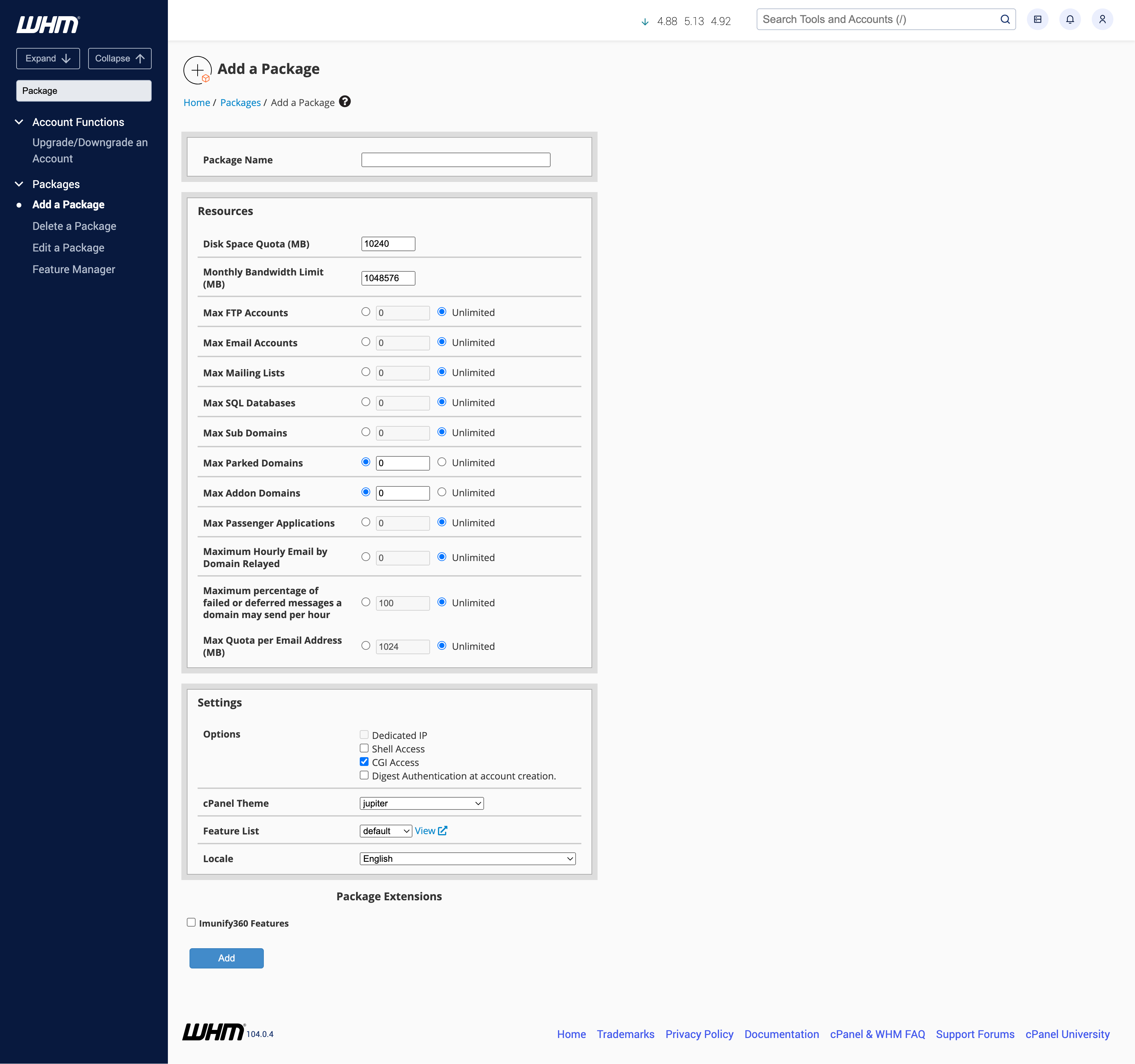 When you login to WHM and wish to create your first cPanel hosting account, you will need to create a hosting package to assign the cPanel account too. The package controls the hosting limits for things such as: